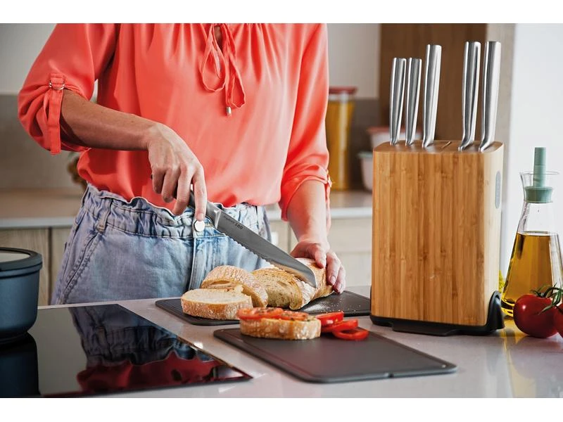 Dieses Brotmesser von Eva Solo ist aus hochwertigem, rostfreiem Stahl gefertigt, der nicht nur lange scharf bleibt, sondern auch sehr pflegeleicht ist. Dieses statische Brotmesser hat einen nahtlosen Übergang von der Edelstahlklinge zum passenden Edelstahlgriff. Der hohle Griff sorgt dafür, dass Sie aus einem komfortablen und ergonomischen Griff heraus schöne Brotscheiben schneiden können. Dieses Messer ist Teil eines «Alles in Einem»-Messerblocks mit integriertem Messerschärfer und dazugehörigen Schneidebrettern.
