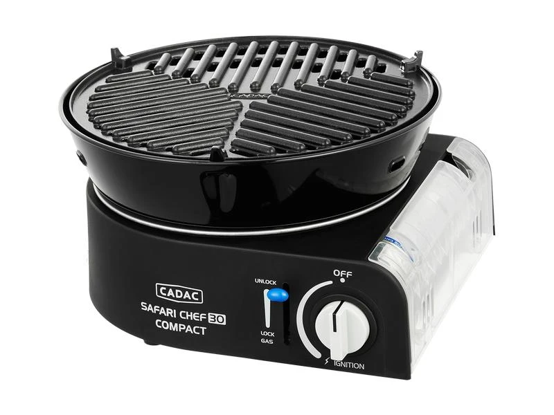 Der Safari Chef 30 Compact ist ein ultrakompakter, leichter Gasgrill. Dieser Grill arbeitet direkt mit einer 227gr-Bajonettkartusche; einfach die Gaskartusche in das Gerät einsetzen, einklicken und schon kann man mit dem Kochen oder Grillen beginnen. Ein ideales Gerät für Outdoor-Aktivitäten und Campingurlaube. Trotz seiner geringen Grösse ist der Safari Chef 30 Compact äusserst vielseitig, da er über verschiedene Kochflächen verfügt: einen Topständer, ein Grillrost und einen Deckel, der auch als Topf genutzt werden kann. Auf dem Topfständer kannst du problemlos einen Topf mit Suppe oder Nudeln kochen. Der Grillrost ist mit der GreenGrill-Beschichtung von CADAC versehen und eignen sich perfekt zum Braten und Grillen von Fleisch, Fisch und Gemüse. Der Deckel kann auch als (Suppen-)Topf verwendet werden und ist somit multifunktional. Die Tropfschale fängt Kochrückstände auf, wenn du den Grillrost benutzt, dient aber auch als Windschutz, damit der Brenner nicht ausbläst.