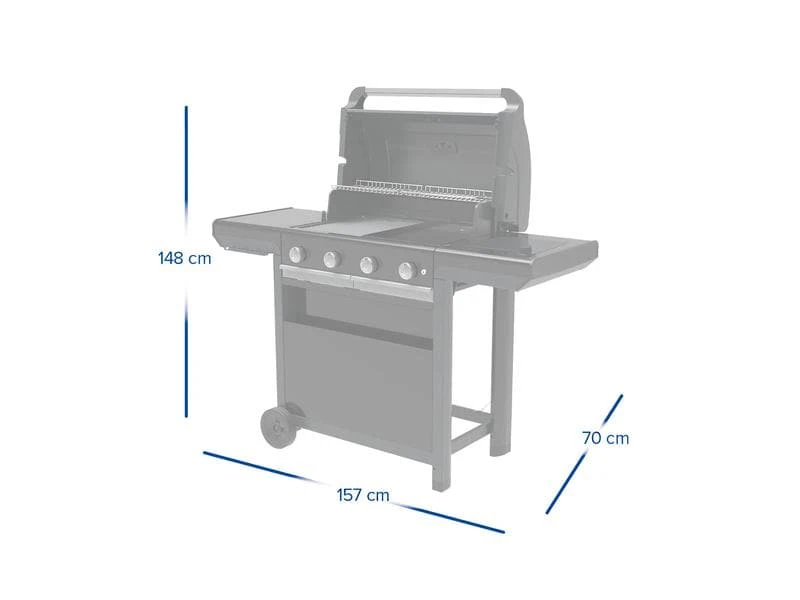 Mit dem 4 Series Select 37475 Gasgrill wird das Zubereiten der Gerichte für die Familie zum Kinderspiel. Der Grill ist mit der Blue Flame Power Brennertechnologie in einem neuen einzigartigen Design ausgestattet, für noch bessere Hitzeverteilung und ein perfektes Grillerlebnis. 4 kräftige Edelstahl Brenner und die grosse gusseiserne Grillfläche mit dem Culinary Modular Basiseinsatz bieten die optimale Kombination, um eine grosse Anzahl an Gerichten zu zaubern. Nach dem Grillen kann der Grill einfach gereinigt werden, dank des einzigartigen und verbesserten InstaClean Aqua Systems. Die elektronische Zündung ermöglicht ein einfaches Starten. Für bequeme Aufbewahrung sorgen Push2Fold Seitentische mit verbessertem Klappmechanismus. Die Abdeckung vorne mit Ablagefach bieten viel Platz für Grillutensilien sowie ein Bereich zum Abstellen einer Gasflasche mit bis zu 6 kg. Die robusten Rasenrollen bieten eine optimale Haltbarkeit und Zuverlässigkeit auf allen Untergründen.