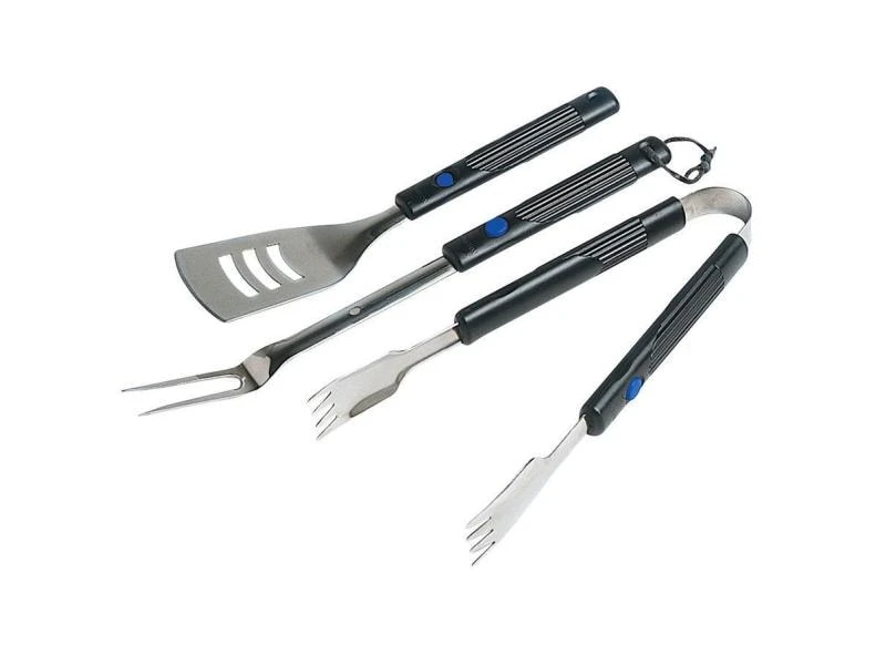 Dieses 3-teilige Grillbesteck-Set mit Bratschaufel, Fleischgabel und Grillzange wurde aus rostfreiem Stahl hergestellt und verfügt über Kunststoffgriffe, die Sie in zwei praktischen Griff-Positionen benutzen können. Verwenden Sie den kürzeren Griff für bessere Kontrolle oder den langen Griff um Ihre Hände vor Hitze zu schützen.
