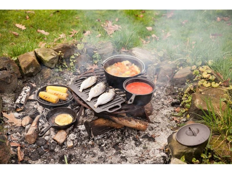 Kochen im Freien über dem Feuer ist ein Erlebnis, ein echtes Abenteuer. Bereiten Sie die köstlichsten Gerichte mit diesem kompletten 7-teiligen Set, bestehend aus einem Dutch Oven, einer Bratpfanne mit Ausguss, einer umdrehbaren Grillplatte mit Handgriffen, einem Stiltopf mit Deckel und einem Deckelhaken. Verpackt sin all diese Komponenten sind in einer Holzkiste, die Griffe aus Juteseilen hat, sodass sie einfach mitzunehmen ist. Ausserdem bietet die Kiste noch Platz für zusätzliche Kochgeräte.