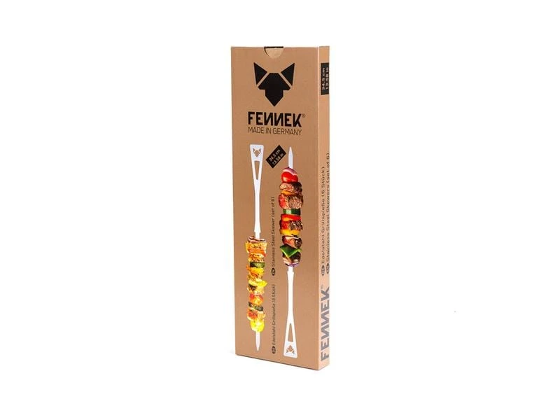 Perfekt für herrliche Spiesse vom Grill. Mit den Fennek Grillspiessen aus hochwertigem Edelstahl und einer umweltfreundlichen und hochwertigen Verpackung wird das Grillen besonders vielfältig. Die Fennek Grillspiesse lang sind zu 100% Made in Germany. Die speziell geformten Griffe machen das Drehen und Wenden super einfach. So bekommt Ihr Grillgut von allen Seiten die richtige Hitze und wird gleichmässig gar! Egal ob Fleisch oder Gemüse, auf deinen Fennek Grillspiessen ist für jedes Grillgut Platz. Die Spiesse haben eine Länge von 34.5 cm cm und eine Dicke von 2 mm. Dank des Klettverschlusses an der nachhaltigen Baumwolltasche lassen sich die Fennek Spiesse leicht transportieren und aufbewahren. Mit einer Länge von 34.5 cm sind sie mit den meisten Grills kompatibel. Des Weiteren sind sie leicht mit Wasser und Spülmittel zu reinigen. Ausserdem sind sie spülmaschinenfest. Das hochwertige Material und die umweltfreundliche Verpackung machen sie zu einer guten Wahl für Ihre nächste Grillparty. Im Lieferumfang enthalten ist neben den Spiessen auch eine nachhaltige Baumwolltasche. Dank des Klettverschlusses an der Baumwolltasche lassen sich die Spiesse leicht transportieren und aufbewahren.