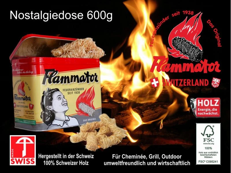 Flammator ist ein Schweizer Naturprodukt, das umweltfreundlich produziert wird, einen hohen Energiewert hat und sowohl für die Holzfeuerung daheim als auch für den Grill im Freien geeignet ist. Der Feueranzünder wird aus naturbelassenem Schweizer Holz und einer ausgewogenen Mischung aus Wachsen und Harzen hergestellt. Die Verbrennung erfolgt deshalb giftfrei und praktisch geruchlos.