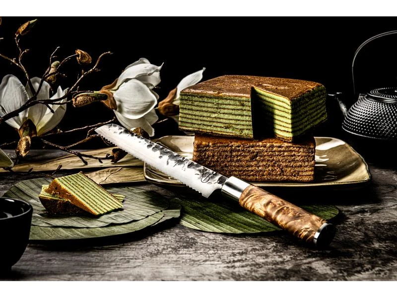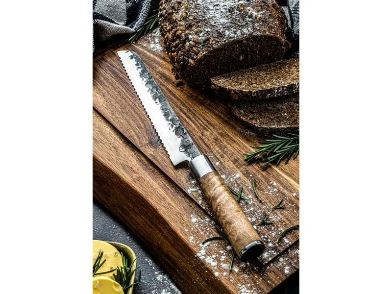 Das Design der VG10-Serie von Forged basiert auf der Inspiration aus der Welt der Messer par excellence «Japan». Dies spiegelt sich im Übergang von der Klinge zum Griff wider. Diese Serie ist nach der Art des für die Klinge verwendeten Stahls benannt. Der japanische VG10-Stahl bietet eine angenehme Härte von stolzen 60 Rockwell. Die Messer sind in 5 Schichten geschmiedet, was den typischen Look, den Sie bei Damastmessern sehen, dezent vermittelt. Diese Techniken sorgen für Schärfe und Schnittkomfort. Die Messer haben einen speziellen Griff aus luxuriösem Wurzelholz und werden mit einer braunen ledernen Messerhülle geliefert.