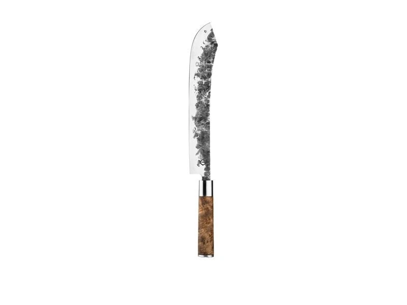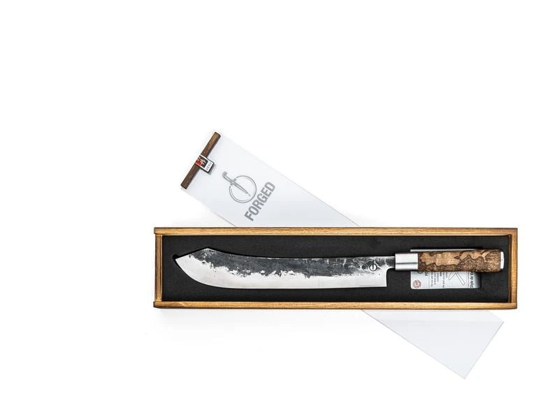 Das Design der VG10-Serie von Forged basiert auf der Inspiration aus der Welt der Messer par excellence «Japan». Dies spiegelt sich im Übergang von der Klinge zum Griff wider. Diese Serie ist nach der Art des für die Klinge verwendeten Stahls benannt. Der japanische VG10-Stahl bietet eine angenehme Härte von stolzen 60 Rockwell. Die Messer sind in 5 Schichten geschmiedet, was den typischen Look, den Sie bei Damastmessern sehen, dezent vermittelt. Diese Techniken sorgen für Schärfe und Schnittkomfort. Die Messer haben einen speziellen Griff aus luxuriösem Wurzelholz und werden mit einer braunen ledernen Messerhülle geliefert.
