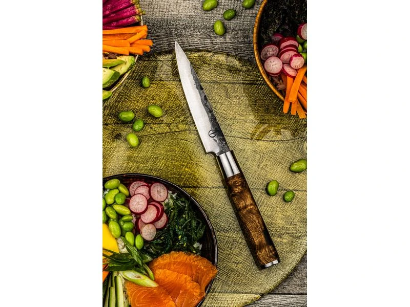 Das Design der VG10-Serie von Forged basiert auf der Inspiration aus der Welt der Messer par excellence «Japan». Dies spiegelt sich im Übergang von der Klinge zum Griff wider. Diese Serie ist nach der Art des für die Klinge verwendeten Stahls benannt. Der japanische VG10-Stahl bietet eine angenehme Härte von stolzen 60 Rockwell. Die Messer sind in 5 Schichten geschmiedet, was den typischen Look, den Sie bei Damastmessern sehen, dezent vermittelt. Diese Techniken sorgen für Schärfe und Schnittkomfort. Die Messer haben einen speziellen Griff aus luxuriösem Wurzelholz und werden mit einer braunen ledernen Messerhülle geliefert.