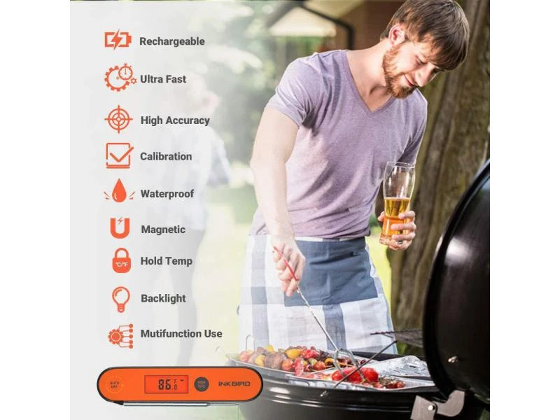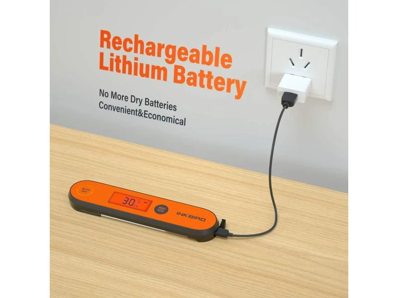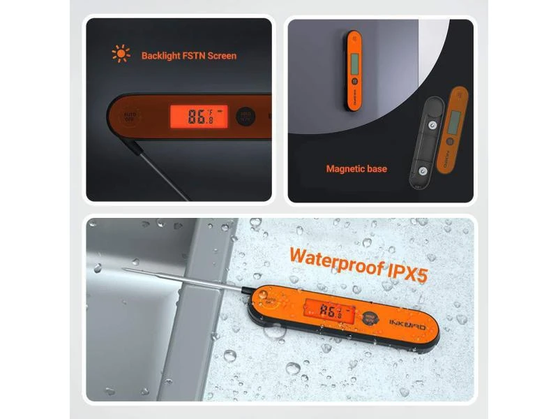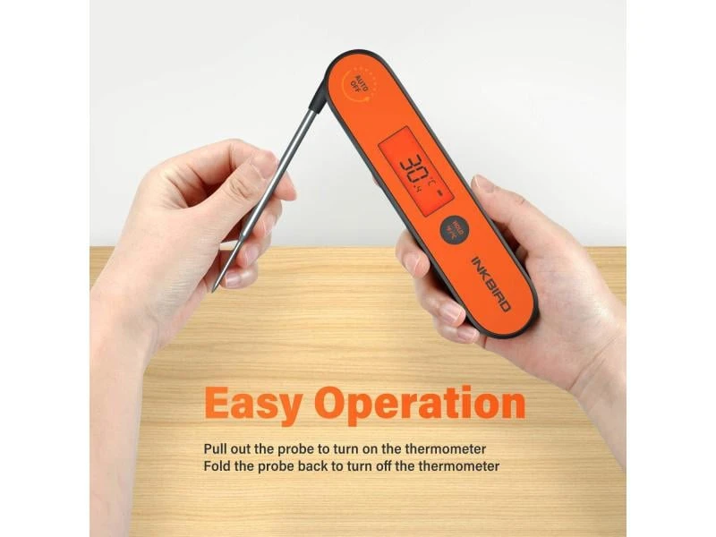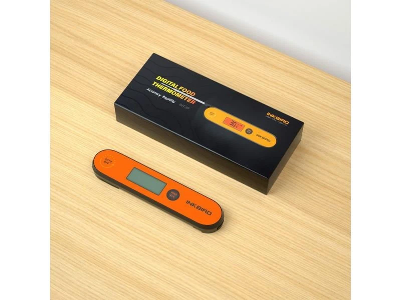 Das handliche Sofortthermometer ITH-1P von Inkbird ermöglicht eine Temperaturmessung in drei bis fünf Sekunden. Aufgebaut ist es wie ein Taschenmesser mit einer ausklappbaren Sonde, und mit 16 cm Länge ist es auch nicht viel grösser. Nicht nur für feste Nahrung, auch für die meisten Flüssigkeiten kann es verwendet werden. Das Gerät ist mit einem 250mAh-Li-Ionen-Akku und einer magnetischen Rückseite ausgestattet und wasserdicht gemäss Schutzart IPX5.