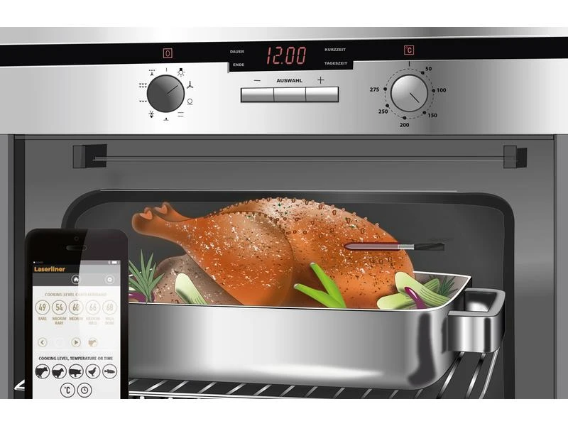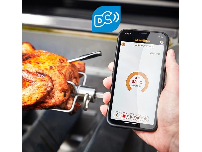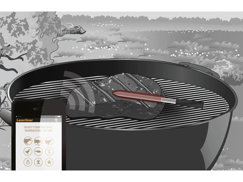 Mit dem kabellosen Thermometer lassen sich perfekte Garergebnisse bei diversen Fleisch-, Geflügel- und Fischsorten erzielen. Die Garstufe, die Kerntemperatur und die Temperatur des Garraums werden präzise gemessen. Die Datenübertragung erfolgt komfortabel per App, die sowohl mit IOS als auch mit Android arbeiten kann. Deutliche Warnungen sorgen für eine effektive Vorbeugung vor der Beschädigung des Grillguts.