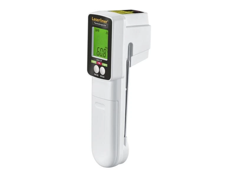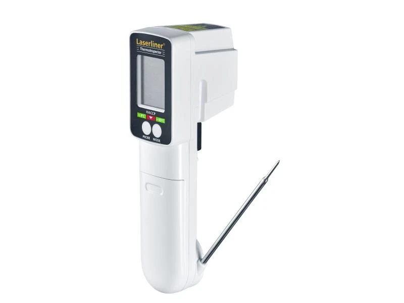 Mit dem ThermoInspector messen Sie Lager- und Verarbeitungstemperatur von Lebensmitteln nach HACCP-Richtlinien. Nebst der berührungslosen Messung ist auch eine Tiefenmessung mittels ausklappbarem Einsteckfühler bis 80 mm möglich.