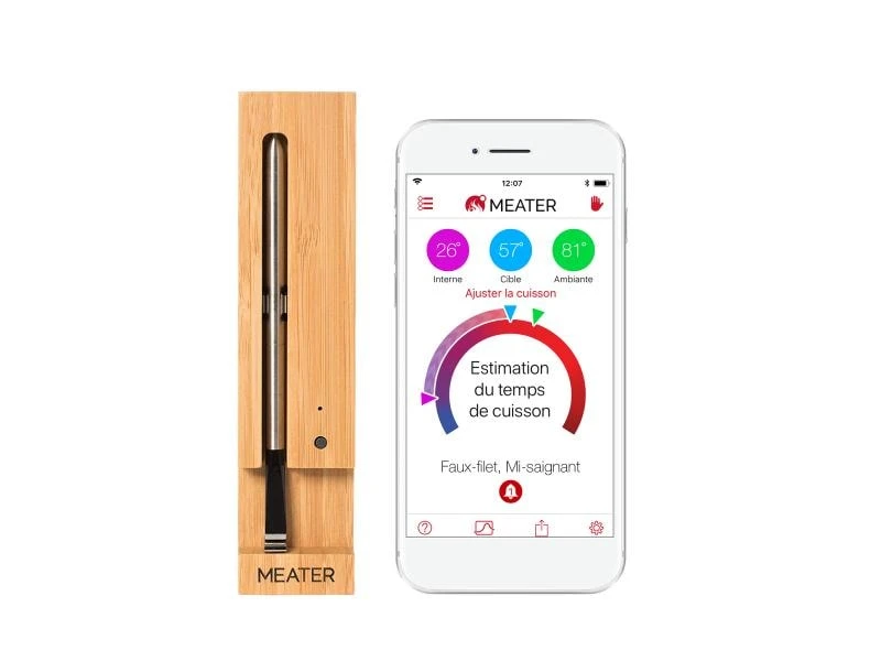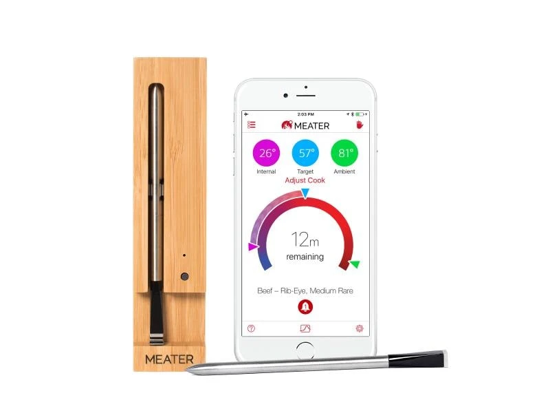 Erzielen Sie beim Braten von Fleisch oder Fisch stets perfekte und gleichmässige Ergebnisse: Mit dem kabellosen Fleischthermometer Meater ist das bequem möglich. Lesen Sie die Innen- und Aussentemperatur (bis 100 bzw. 275 °C) auf Ihrem Smartphone ab; leicht können Sie genau im richtigen Moment reagieren und bei der Zubereitung individuelle Vorlieben berücksichtigen. Speichern Sie Ihre besten Garvorgänge und wiederholen Sie diese mit einem einzigen Tippen; erhalten Sie einen Alarm, wenn es fertig ist.