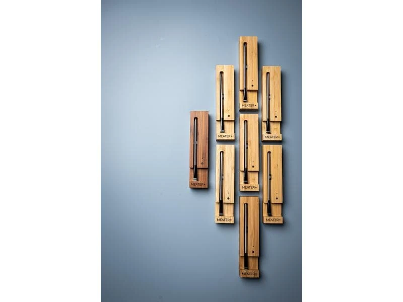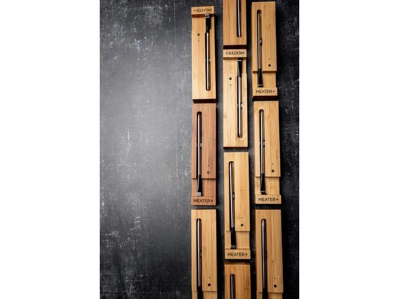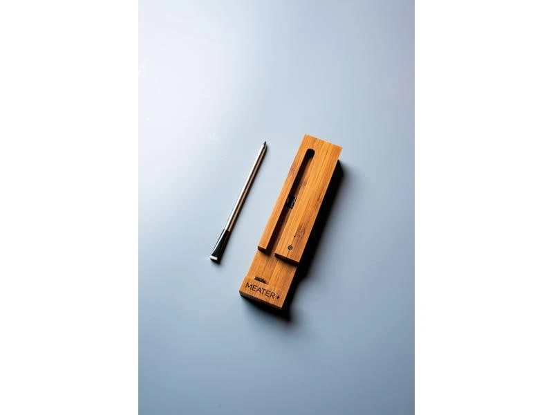 Im Fühler des Meater ist die gesamte Messtechnik enthalten; die Daten übermittelt er via Bluetooth mit einem Repeater zur Erweiterung der Reichweite über bis zu 50 Meter an Ihr Smartphone. Die attraktive Ladestation aus Holz, die sich dank einer magnetischen Rückseite z.B. an einer Kühlschranktür befestigen lässt, lädt den Fühler mit einer herausnehmbaren AAA-Batterie bis zu 100 mal.