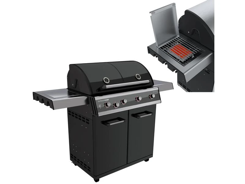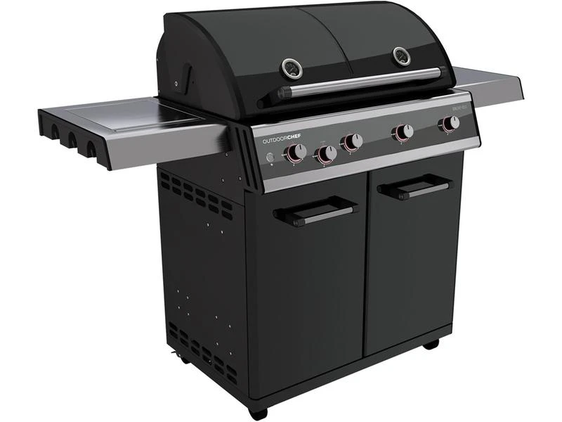Kennzeichen der DUALCHEF Gasgrill Stationen ist das in der Schweiz entwickelte und patentierte Dual Gourmet System (DGS). Diese Technologie vereint zwei durch den Zone Divider aufgeteilte Temperaturzonen unter einer Haube, bei perfekter Hitzeverteilung. So kann auf einer Seite bei hohen Temperaturen über 360 Grad gegrillt werden, während auf der anderen Seite bei Temperaturen ab 80 Grad grosse Fleischstücke oder Fisch niedergegart werden. Für ein schönes Branding dieser multifunktionalen Steak Maschine sorgen die hochwertigen Gusseisenroste, welche eine optimale Hitzespeicherung garantieren. Zudem verfügen die Outdoorchef DUALCHEF Modelle über einen HEAT DIFFUSER, welcher die Hitze konzentriert auf den Drehkorb (nicht im Lieferumfang enthalten) lenkt und damit den Gasverbrauch reduziert. Gleichzeitig sorgt die konzentrierte Hitze für eine schöne Kruste am Fleisch oder Brathähnchen. Das Safety Light System (SLS) in den Drehreglern aktiviert sich, sobald das Ventil geöffnet wird. Der Lichtsensor passt die Intensität der LED-Leuchten automatisch der Umgebungshelligkeit an. Robuste abklappbare Seitenablagen bieten genügend Platz für die Vorbereitung der Speisen. Der DUALCHEF 425 G verfügt zudem über eine Blazingzone. All diese Features machen ihn zu einer perfekt ausgestatteten Outdoor Küche, die keine Wünsche offenlässt.