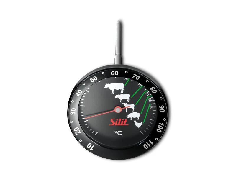 Das Bratenthermometer Sensero von Silit zeigt Ihnen genau an, wann Ihr Braten die ideale Kerntemperatur erreicht hat. Es besteht aus hitzebeständigem Glas und hochwertigem Edelstahl. Der Messbereich für die Kerntemperatur liegt zwischen zehn Grad Celsius und 110 Grad Celsius und kann während des gesamten Garvorgangs im Ofen oder auf dem Grill abgelesen werden. Das Thermometer ist bis 250 Grad Celsius hitzebeständig. Illustrationen zeigen Ihnen zudem die idealen Innentemperaturen für Rind, Kalb, Lamm, Schwein und Geflügel an.