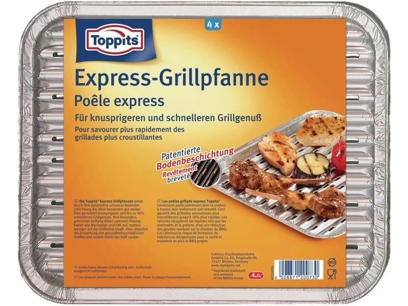 Ich habe die Toppits Grillschale Express für unser Familien-Grillfest verwendet und sie hat ihre Aufgabe perfekt erfüllt. Kein Anbrennen und einfache Reinigung. Super Produkt!