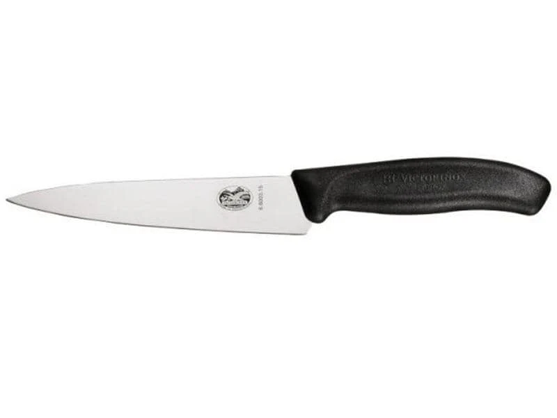 Dieses Messer von Victorinox dient zum Tranchieren von Fleisch. Die Klinge hat eine zur Mittelspitze hin leicht geschwungene Form, einen glatten Schliff und eine Länge von 150 Millimeter. Der Griff ist aus dem hitzebständigen Kunststoff Fibrox.