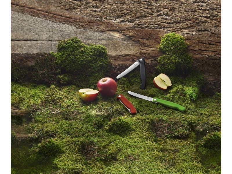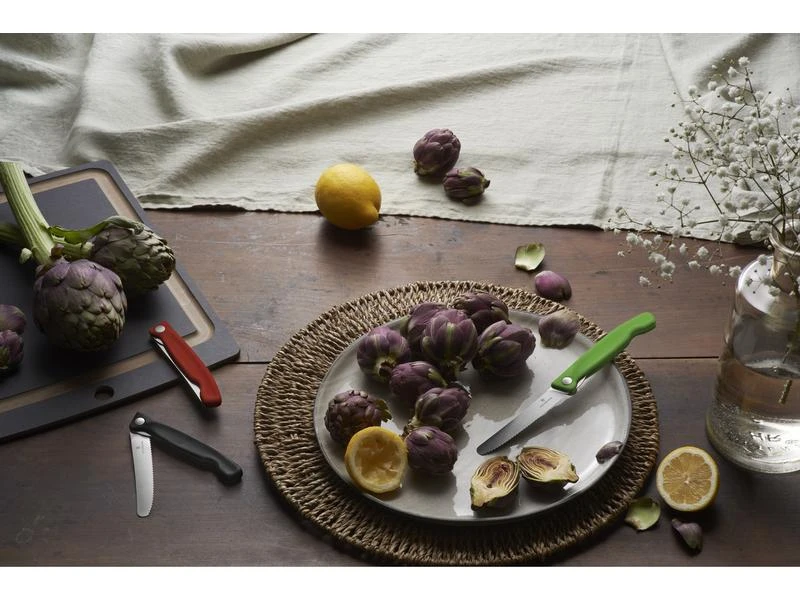 Das Swiss Classic Gemüsemesser von Victorinox mit geradem Schliff ist ein Multitasker par excellence. Es überzeugt mit grenzenloser Vielseitigkeit, markantem Design und kompakter Silhouette. Die strapazierfähige rostfreie Stahlklinge dieses kompakten Messers lässt sich gesichert im Griff unterbringen und mit einem einfachen Entriegelungssystem verlässlich fixieren. Eine grosse Bandbreite farbenfroher Griffe und praktischer Sets sorgt in der Küche und in der freien Natur für mehr Spass bei jeder Aufgabe. Äpfel schneiden, Chilis entkernen, Briefe öffnen in Ihrem Büro oder Sie auf Outdoor-Abenteuer begleiten – dieses leichte, faltbare Gemüsemesser ist zu allem bereit.