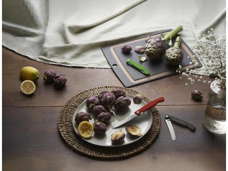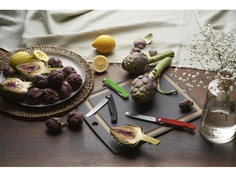Das Swiss Classic Gemüsemesser von Victorinox mit Wellenschliff ist ein Multitasker par excellence. Es überzeugt mit grenzenloser Vielseitigkeit, markantem Design und kompakter Silhouette. Die strapazierfähige rostfreie Stahlklinge dieses kompakten Messers lässt sich gesichert im Griff unterbringen und mit einem einfachen Entriegelungssystem verlässlich fixieren. Eine grosse Bandbreite farbenfroher Griffe und praktischer Sets sorgt in der Küche und in der freien Natur für mehr Spass bei jeder Aufgabe. Äpfel schneiden, Chilis entkernen, Briefe öffnen in Ihrem Büro oder Sie auf Outdoor-Abenteuer begleiten – dieses leichte, faltbare Gemüsemesser ist zu allem bereit.