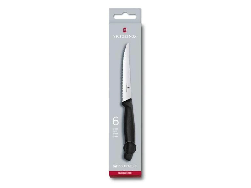 Schneiden Sie mit dem sechsteiligen Steakmesser-Set von Victorinox wie ein Profi. Die Messer sind mit einer äusserst scharfen Klinge mit Wellenschliff ausgestattet und liegen dank ergonomisch gestaltetem Griff gut in der Hand. Da die Messer zeitlos designt sind, machen sie auf jedem gedeckten Essenstisch einen hervorragenden Eindruck.